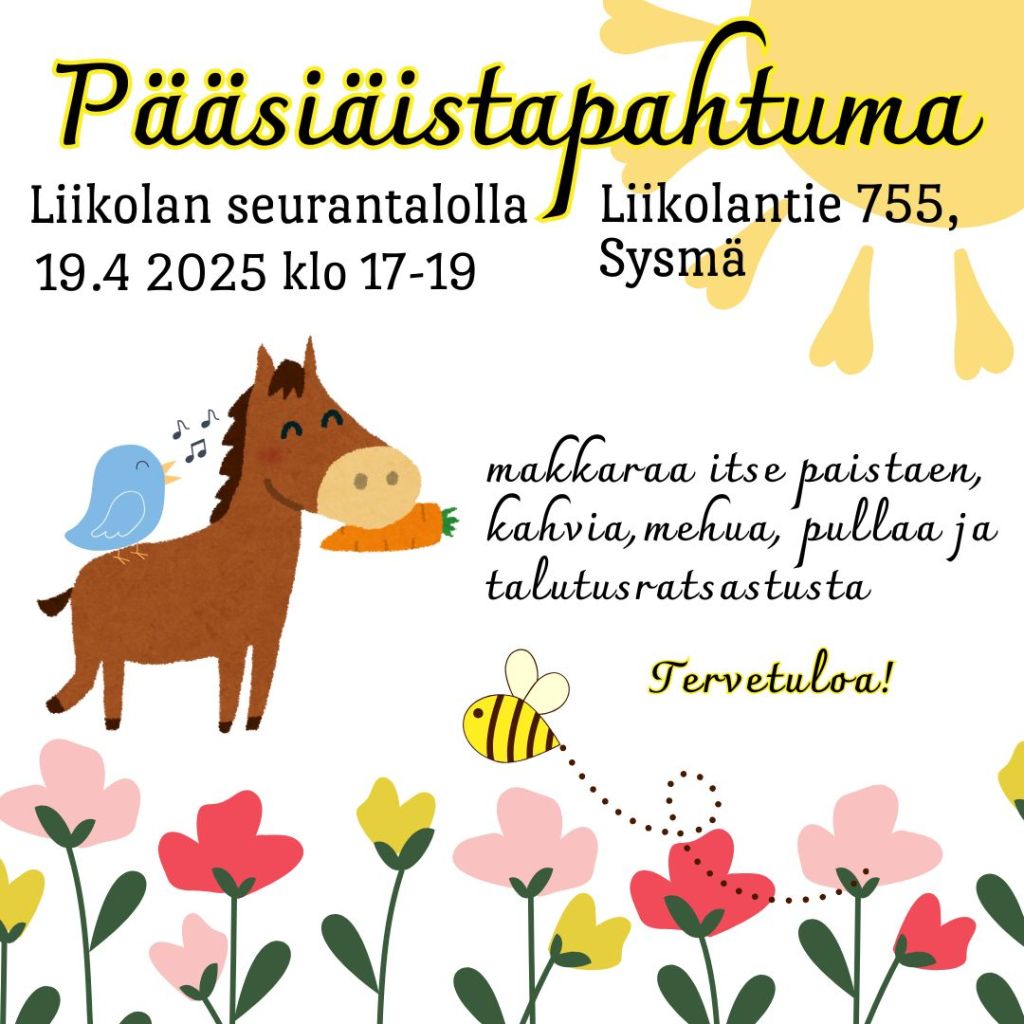 Niin ja hei! Perinteinen pääsiäistapahtuma taas Liikolan seurojentalolla 19.5. klo 17-19, jossa ollaan heppojen kanssa taas viihdyttämässä lapsia! Tuu säkin! 🙂