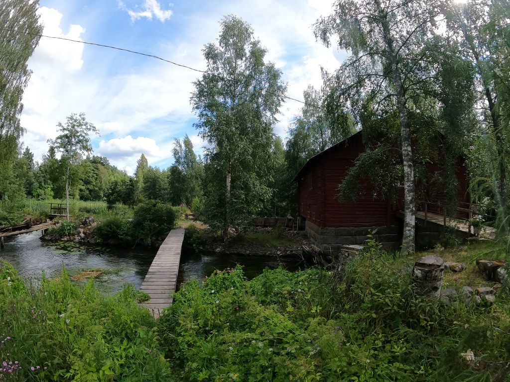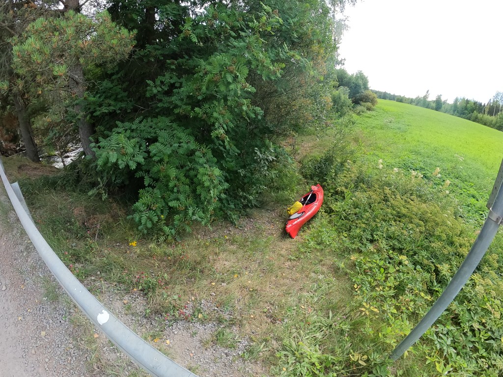Kirveskosken padolla on ehkä kantomatkoista haastavin kohta, kun on tienylitys, ylä- ja alamäki ja tieaidan alitus, vaikka matka ei olekaan pitkä. Oltiin mekin siinä hetken liikenteen tukkeena säheltämässä. Onneksi ei ole vilkas liikenne ja autot liikkuu hiljaa. Padon jälkeen on aina hauska meloa virtauskohtaan ottamaan vähän vauhtia. Tähän mennessä ollaan muuten nähty lähemmäs 20 haikaraa! Loppukesän ja alkusyksyn melontareissuilla on kyllä melkein varmasti hirveä määrä haikaroita Tainionvirralla ja paras paikka niitä nähdä on juurikin Koskenniemen Campingin ja Hotilan väli.