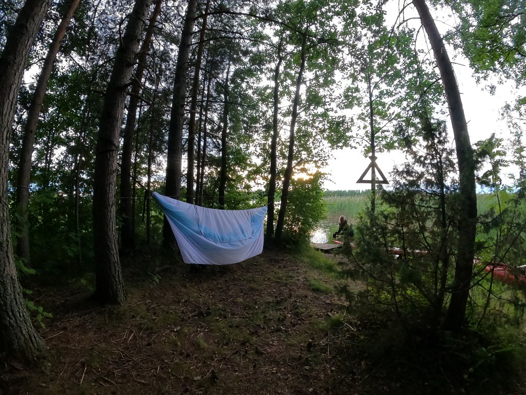 Riippumatto on vasta toista kertaa käytössä ja viimekerrasta oppineena olen hommannut alustan eristämään kylmää paremmin. Toki meikän makuupussi kaipaisi päivittämistä (se on ollut mulla jostain 10 vuotiaasta asti) ja olenkin varautunut kunnon villakerrastolla yöhön. Piirrän hetken maisemaa ja luen Philip Pullmanin Kultaista kompassia, joka yllätti koukuttavuudellaan iloisesti. (Yleensä luen samoja fantasiakirjoja uudestaan ja uudestaan.)