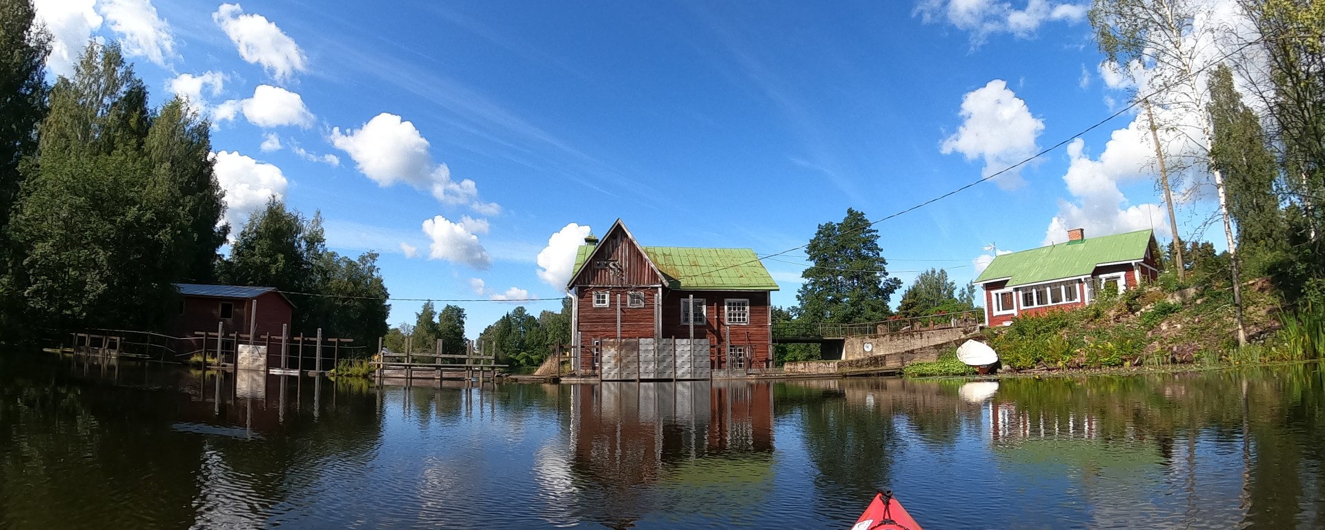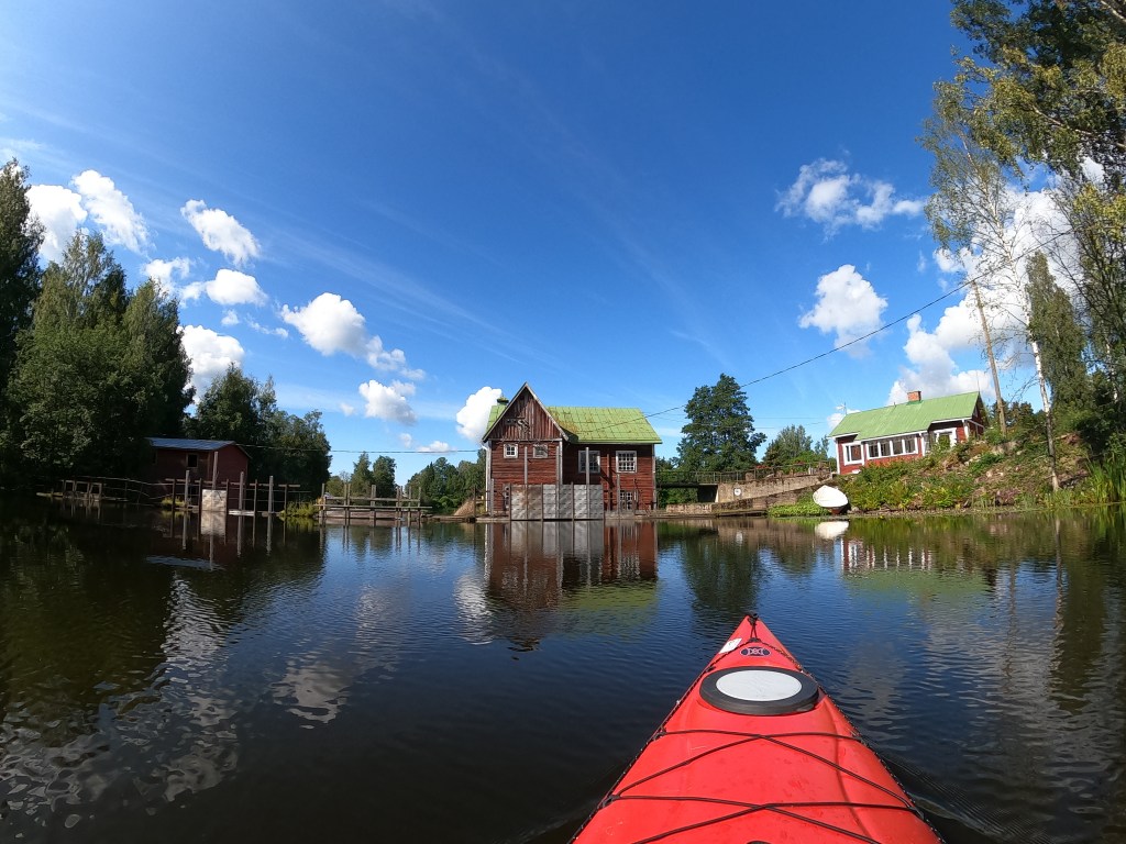 Saavumme Virtaalle ja padon ylityksen jälkeen jokiosuus alkaakin olla ohi ja väylät levenevät. Pysähdymme ihastelemaan upeita lumpeenkukkaryppäitä. Kaislikon seassa on vielä ihanat tyynet hetket ennen viimeistä rutistusta sivuaallokossa. Vasen käsi joutuu tekemään enemmä hommia kajakin suorassapitämiseen, kun evä ei tullut mukaan. Alkaa jo mukavasti tuntua lihaksissa tämä viimeinen etappi.