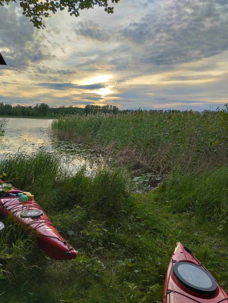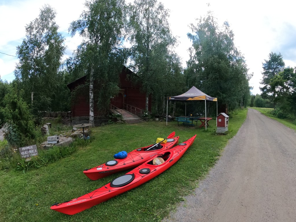 Campingin rannassa olemme 13.45. Päivämatkat olivat 20km ja 23km, jotka meloimme 4,5h ja 5h ajassa. Kajakki oli mun mieleen, eteni hyvin aallokossakin ja oli muutenkin näppärä, tavarat mahtui hyvin ja ne sai kajakin sisään suojaan. (vrt. viimekerralla meloin Tainionvirran ilmatäytteisellä pikkukajakilla ja aikaa kului 8h(Koskenniska-Nuoramoisten silta)+6h (Nuoramoisten siltaa-Camping Sysmä)).