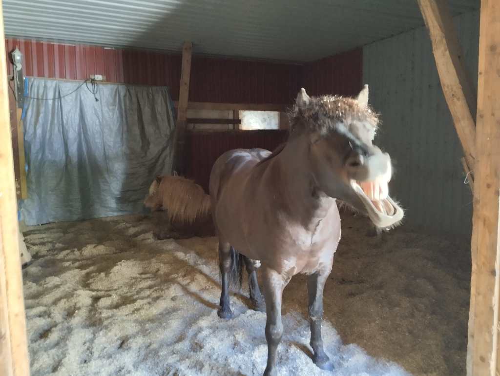 Illalla siivoamme Annan kanssa karsinat ja Bjarni näyttää hevosten ruokinnan sekä tarhaamisen. Hevosten käsittely tapahtuu pääosin ilman riimuja tai muita apuvälineitä ottamalla hevosta leuan alta kiinni sitä siirrettäessä tai ajamalla ne tarhasta karsinoihin.