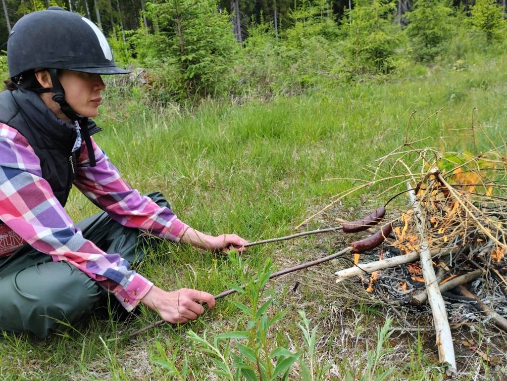 Mirpin ansiosta meidän vaelluskuorma ratsastaessa oli todella kevyt (toisin sanottuna vain vesipullo ja (liian) vähän evästä). Miro toi kaiken tarvittavan yöpymispaikalle. ”Nerokas” idea kertakäyttögrillistä ei olis toiminut ilman huoltopakusta löytynyttä töhötintä. Sillä paisteltiin makkarat ja herkkusienet pekonilla ja sulatejuustolla. Ei olla Jennin kanssa kumpikaan mitään eräkokkeja, mutta ei nyt sentään sorruttu kylmään purkkiruokaan tällä kertaa…