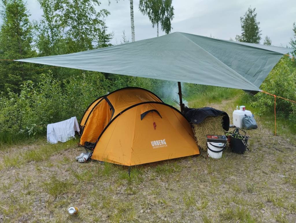 Yöksi oli luvattu kovaa sadetta, joten hylkäsin suosiolla ajatukseni riippukeinussa nukkumisesta ja tunkeuduin Jennin telttaan. Miron pressun avulla saatiin vielä lisätilaa heinille ja muille tavaroille ja varmistettiin, että ei tuu vedet telttakankaasta läpi. Hepat taisi vaan nauttia sateesta.