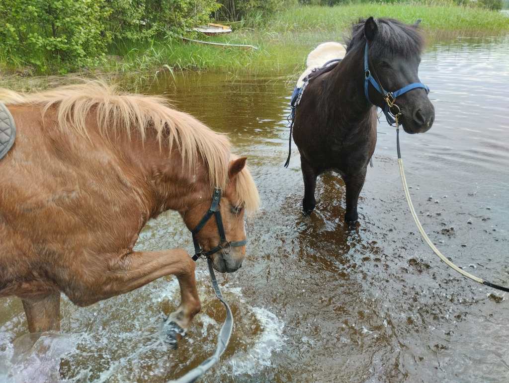 Saavumme Tepoolle ja käymme juottamassa hevoset järven rannalla. Yllätykseksemme järvi on tulvinut oikein huolella; rannoista ei ole merkkiäkään. Kahlaamme hevosten kanssa ja ne selvästi nauttivat viilennyksestä; polskuttelevat vettä jaloillaan ja turvallaan ja etenevät mahaan asti yltävässä vedessä korvat hörössä. Matalammassa vedessä Slepe päättää koittaa piehtarointia, onneksi veli ehtii hypätä selästä ja estää sitä kääntymästä kyljelleen satulalaukun päälle. Rytäkässä suitsetkin lentävät päästä. Onneksi mikään ei hajonnut, eikä ketään sattunut.